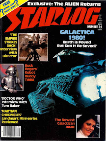 Okay, here it gets a bit personal. It goes back to Stangel's Super Valu grocery store in Manitowoc, Wisconsin. I, a 12-year-old science fiction fan, had been eyeing and paging through the Starlogs and Fantastic Films and Future Lifes at the magazine rack for months, but only now ("now" being April 1980) did I save up enough of my weekly allowance to purchase a copy of Starlog. I was hooked instantly, and I was a constant reader for three decades until the magazine closed in 2009. I absolutely absorbed Starlog #34, and decades later I could still recount many of the articles even without picking up the issue. The reason wasn't quite as pathetic as it sounds; I did have a life, but in Starlog I found two things: a magazine devoted to something I was beginning to get into big-time (i.e., science fiction), and a publication that wasn't afraid to challenge me and take me outside of my comfort zone. The only downside of this is that this issue was devoted to Galactica 1980, and I'd love to say that I was so precocious as a 12-year-old that I knew that the original Galactica (not to mention the 1980 rebirth) was silliness; but the truth is that even with a dozen years under my belt, I was totally swept away with the saga and the mythos of Battlestar Galactica. I did understand that Galactica 1980 was a low-budget and poorly constructed retread of the show, so give me that. But still, that color shot on the cover of the Galactica being attacked by a Cylon fighter -- well, I just had to have that magazine.